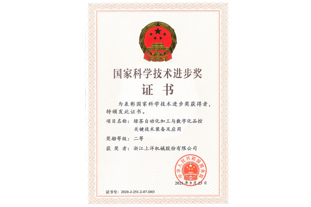 • 2021年11月3日,公司與安徽農業大學等單位聯合申報的《綠茶自動化加工與數字化品控關鍵技術裝備及應用》獲得國家科學技術進步獎二等獎。公司按照“品控數字化-加工自動化-技術體系化”思路,歷經14年攻關和應用,獲獎項目技術及裝備推廣至我國所有產茶省(市、區)的 1200 多家茶葉企業。