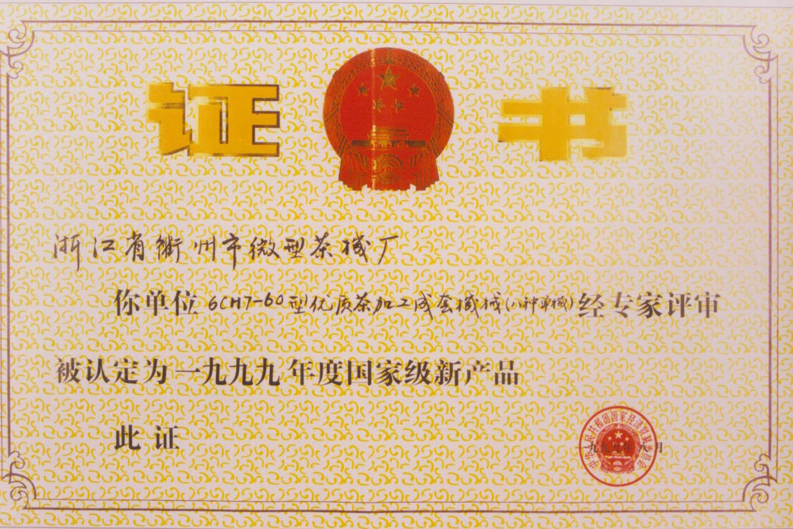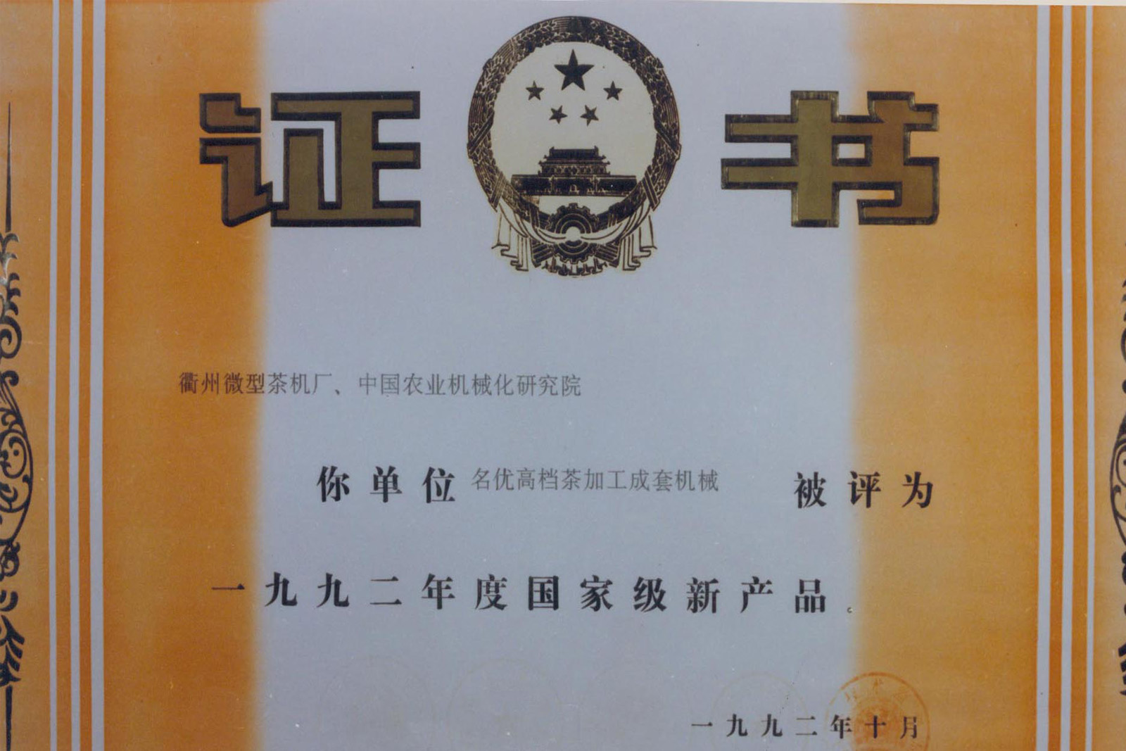 • 1992年10月,公司自主開發的“名優高檔茶加工成套機械”通過國家級新產品鑒定,促進與推動了我國茶葉加工向機械化、效率化、商品化方向發展。
