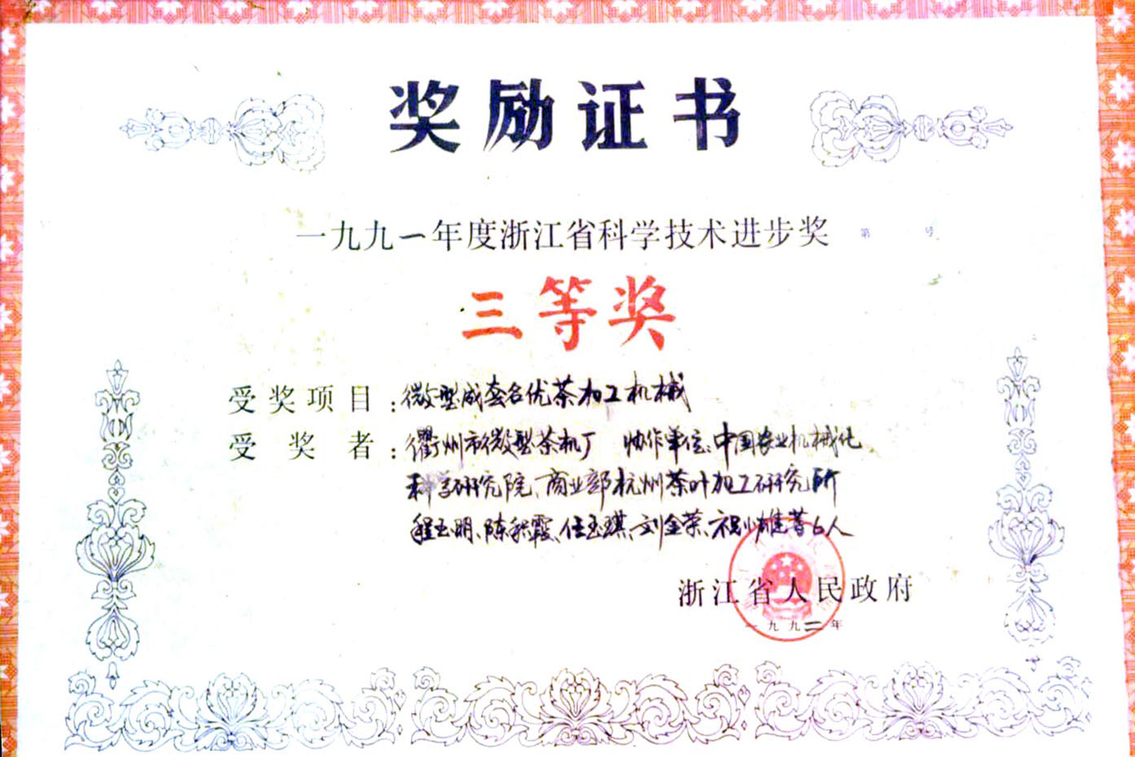 • 1991年,微型成套名優茶加工機械通過省級新產品鑒定,這是國內最早通過省級鑒定的茶機產品,同年該產品分別榮獲浙江省科技進步三等獎。
