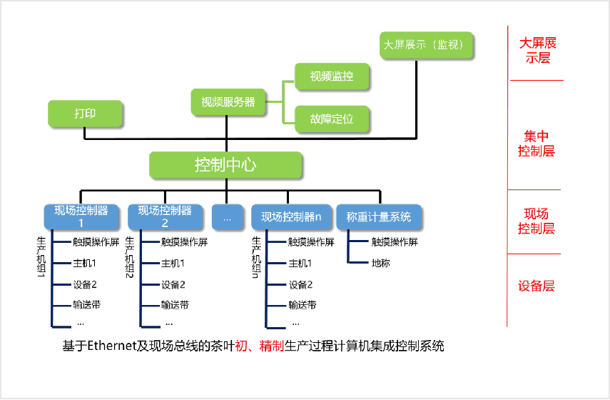 控制系統(tǒng)采用網(wǎng)絡(luò)技術(shù)及現(xiàn)場(chǎng)總線技術(shù),分為大屏展示(監(jiān)視)層、集中控制層、現(xiàn)場(chǎng)控制層和設(shè)備層共四級(jí)。系統(tǒng)通過(guò)網(wǎng)絡(luò),將現(xiàn)場(chǎng)控制單元進(jìn)行互聯(lián),將所有數(shù)據(jù)集中到總控計(jì)算機(jī)上,從而形成對(duì)整條生產(chǎn)線的控制以及生產(chǎn)參數(shù)與報(bào)表的匯總,并把相關(guān)的展示信息和畫面監(jiān)控信息投送大屏展示層,具備傳輸信號(hào)容量大、實(shí)時(shí)性強(qiáng)的特點(diǎn)。