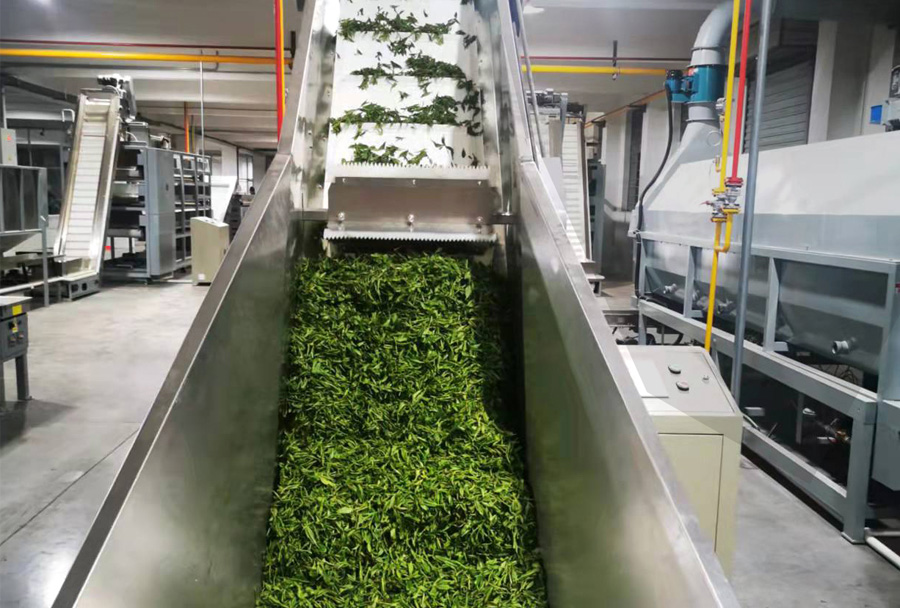 茶葉輸送機是茶葉加工生產(chǎn)線的重要組成部分,分皮帶式、振動槽式等,可平面輸送、高低錯位輸送,根據(jù)需要再配套勻葉、清理、調速、除塵等裝置,在整個生產(chǎn)線中起到連接主機、控制產(chǎn)能、平衡流量等功能,是生產(chǎn)線實現(xiàn)不落地、清潔化生產(chǎn)必不可少的配套設備。